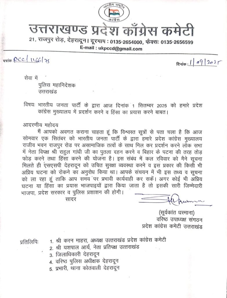 देहरादून। कांग्रेस प्रदेश वरिष्ठ उपाध्यक्ष सूर्यकांत धस्माना ने डीजीपी को पत्र लिखकर कांग्रेस मुख्यालय की सुरक्षा बढ़ाने की मांग की है। धस्माना ने आशंका जताई है कि भाजपा कार्यकर्ताओं के प्रदर्शन को देखते हुए किसी भी प्रकार की अप्रिय स्थिति उत्पन्न हो सकती है।
